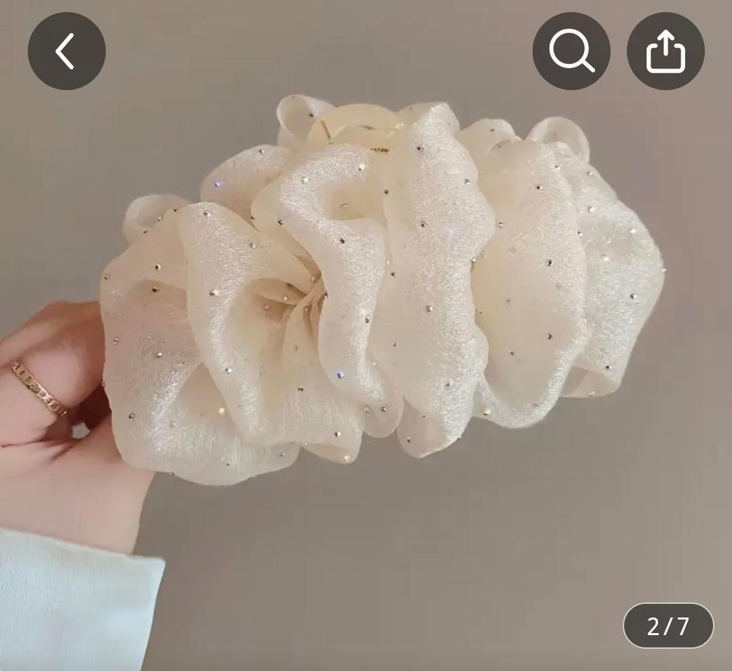 이 머리핀은 쉬폰이나 오간자 원단으로 만든 볼륨 리본 집게핀입니다. 반투명쉬폰(약10*70cm), 반짝이 글리터 천, 실, 바늘, 글루건, 집게핀을 준비하여 먼저 원단을 10*70cm가 되도록 자르고 가장자리를 오버록 하세요. 긴쪽 한줄을 따라 홈지을 해서 실을 당겨 주름을 잡고 양끝을 연결해 원형으로 만들거나 꿰매거나 글루건으로 붙입니다. 가운데 부분을 살짝 접어 볼륨감을 준뒤 집게핀 위에 글루건으로 단단히 고정한 후 반짝이 파우더, 비즈, 진주 등을 붙여 포인트를 주도록 합니다. 이렇게 하면 풍성하고 반짝이는 헤어핀이 완성됩니다