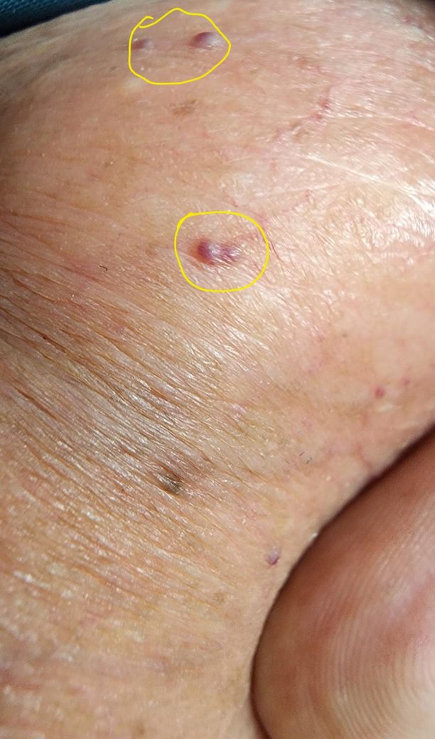 사진 범위가 제한적이지만, 지금 보이는 모습과 설명(통증 없음, 둥근 덩어리 느낌, 오래된 피 멍처럼 보임)을 종합하면 다음 가능성이 가장 흔합니다.