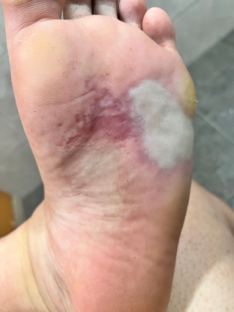 사진상으로 보았을때 정확한 상태를 알 수 없지만 발바닥에 무리한 자극이나 반복된 상처로 인해서 그랬을 가능성이 높으며 최대한 자극을 주지 않는게 좋을 것으로 생각되며 정확한 상태를 알 수 없기 때문에 가까운 병원에 방문하시어 상태 검사 받아보시고 상태에 맞는 치료 및 처치등을 받아보시는게 좋을 것으로 생각됩니다.