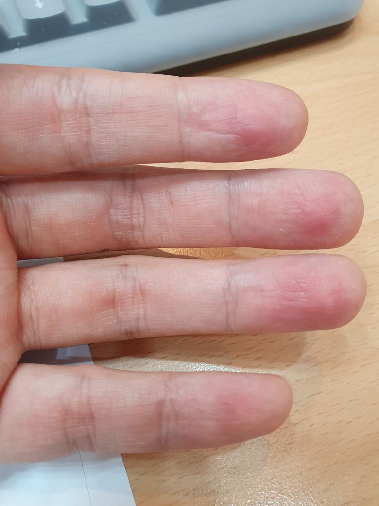 현재는 10 손가락 다 벗겨지고 손끝 바닥 부분이 매우 붉어진 상태입니다.