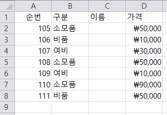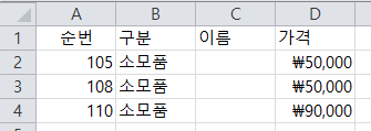 123.xlsx로 저장된 시트에서 소모품에 해당하는 값이 생길때마다