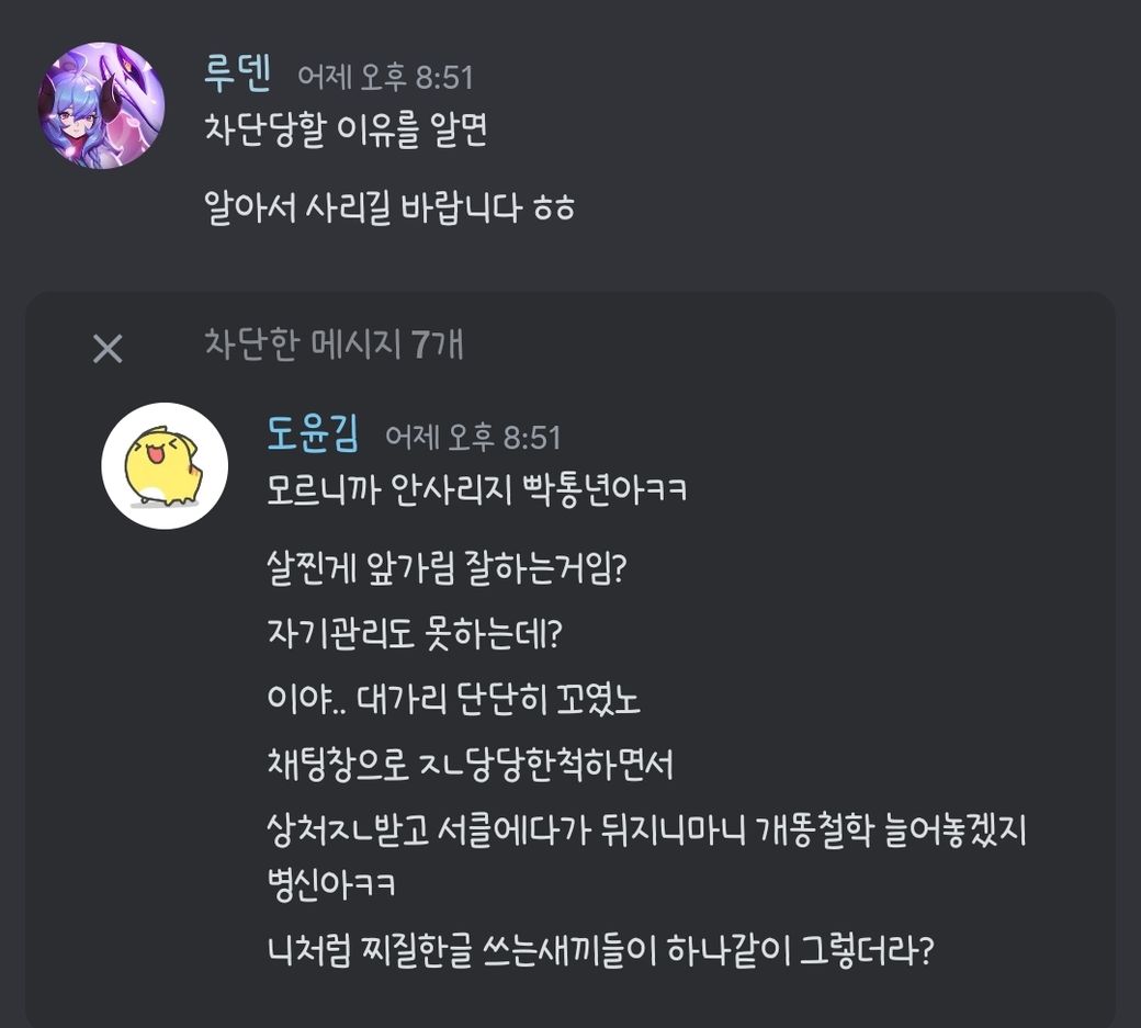 글에선 계속 "니"라고 언급하며 저의 정확한 닉네임을 언급하지 않았는데 괜찮을까요? 다만 저 상황에서 대화를 하고 있었던 것은 저와 저 사람 둘 뿐이었습니다. 또한 저 채팅방에는 저와 저 사람 말고도 다른 사람을이 여럿 있었는데 그 중 제 닉네임(루덴)=저 라는 걸 알고있는 현실 친구도 몇몇 포함되어 있습니다.
