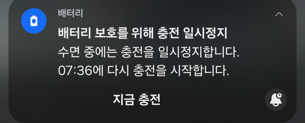 배터리가 없을 때 충전을 시켜 놓고 주무시는 거 같은데 새벽에만 그런 이유가 배터리 보호 기능을 켜 놓으신 거 같은데요 그거를 켜 놓으면 배터리가 일정량 충전이 되고 그 다음 충전이 안 됩니다