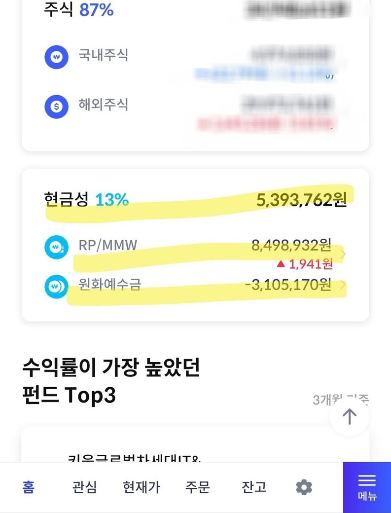 국내,해외주식금액 밑에