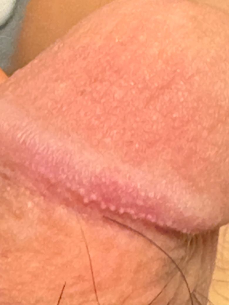 진주양음경구진으로 보입니다. 매우 흔하며 병적인 현상이 아니기 때문에 치료가 필요하지 않습니다.