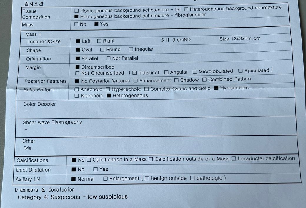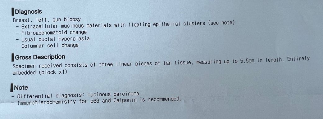 대화 나눈 후 나오면서 뭔가 찜짐하여 처음 조직검사 결과지 받은 내용을 보니,