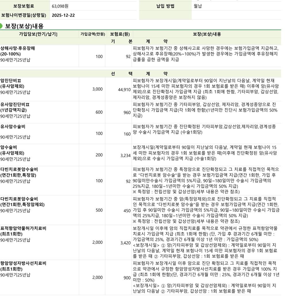 제가 볼때에는 암보장을 진단비, 수술비 중심으로 잘 설계받았다고 봅니다. 다만 다양한 부가특약이 포함되어 있어서 보험료가 높아지므로 각 특약의 필요성을 신중히 판단해서 핵심 보장 위주로 갈지도 고려해보셔야 합니다. 향후 보험료 지출이 어려워질 경우에는 특약 중에서 불필요하다고 생각되는 것을 삭제하고 감액제도를 활용해서 보험료를 줄이고 보험금액을 줄이는 방식을 활용해볼 수도 있습니다. 지금 현재로서는 그렇게 문제가 되지는 않아 보이지만 가족력, 환경적인 부분, 술과 담배를 어느 정도 하는지 등을 감안해서 차근차근 필요한 보장인지, 불필요한 보장인지를 보고 나중에 조정하셔도 되겠습니다. 현재로서는 무난하게 잘 설계를 했다고 봅니다.