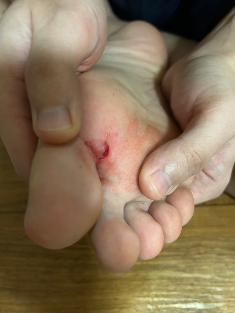 상처의 양 가장자리가 서로 가까이 있는가, 아니면 상처의 양 가장자리를 잡아당겨야 노출된 조직을 가릴 수 있는가도 중요한데, 상처의 양 가장자리를 잡아당겨야 노출된 조직이 가려진다면 상처를 꿰매야 한다는 뜻입니다. 해당 상처는 꿰메는 것이 더 나을 것 같다고 판단됩니다.