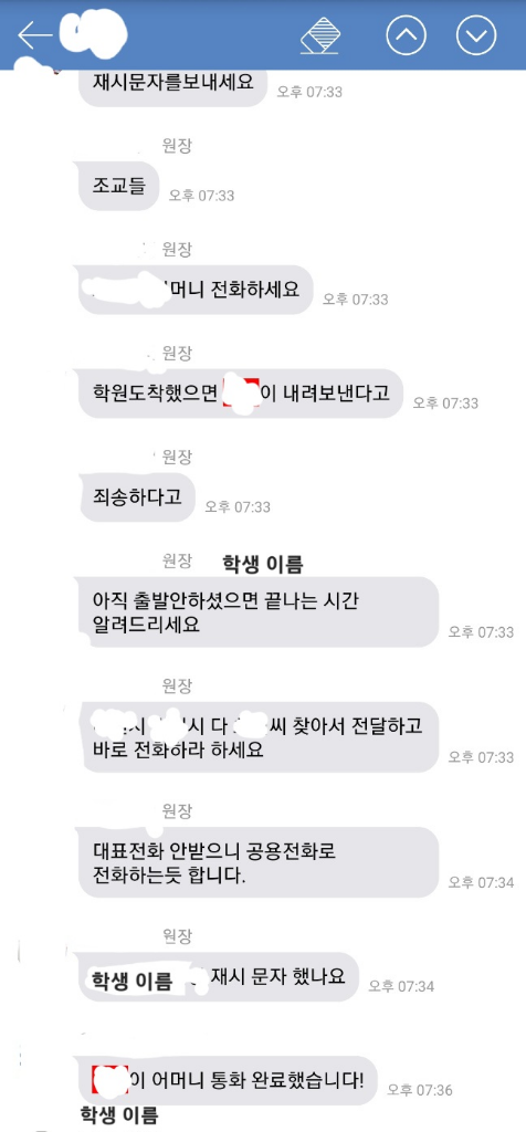 그래서 화가난 원장이 학생들이 다 앉아 있는데 조교 2명한테 ”왜 일처리를 그딴식으로 하냐“, ” 내가 조교 때문에 학부모한테 사과를 해야하냐“, ”조교가 직접 학부모한테 사과할 거냐“, 라고 말하면서 공개적으로 조교에게 망신을 주면서 모욕감을 줌
