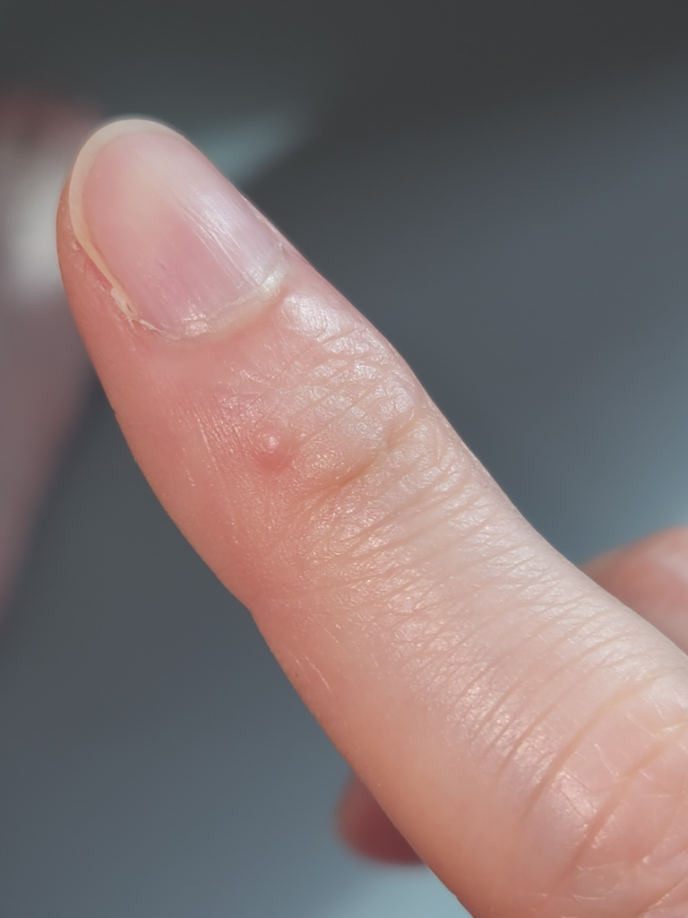 마찰, 압력, 염증 등에 의한 일시적인 물집일 가능성도 있으나, 딱딱해지며 오래 지속되는 경우에는 사마귀일 가능성도 있습니다. 이 경우에는, 피부과 진료를 통해 제거하시는 것이 좋겠습니다.