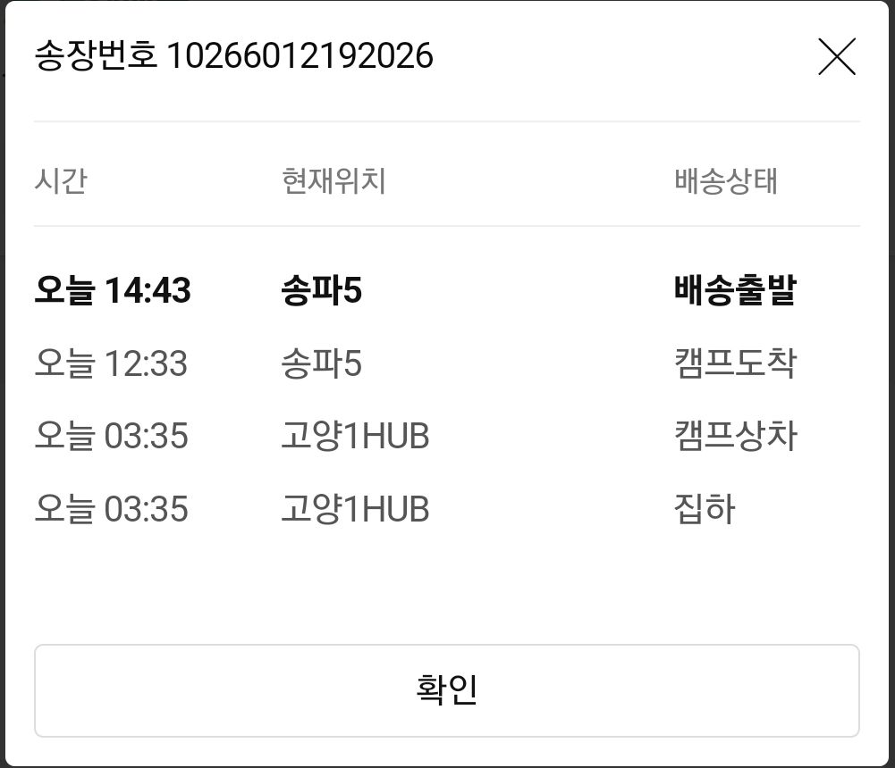 사진에 나와있는 것처럼 14시 43분에 출발 했는데.. 아직도 도착을 안했구 오눌 도착 보장이라고만 떠있어요.. 오늘 안에 도착 하는건가요?