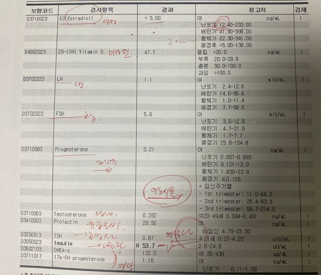 현재 검사결과를 보면 에스트로겐 수치가 낮게 나오고, 인슐린수치가 높게 나온 것으로 보아 인슐린저항성으로 생각됩니다.