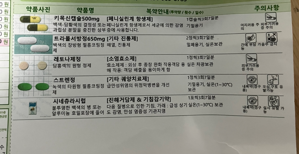 혹시나 세균성 폐렴이 동반될까봐 예방적으로 항생제를 함께 넣어주셨고 이외에 소염제, 진통제, 기침약을 넣어주신 상황입니다.