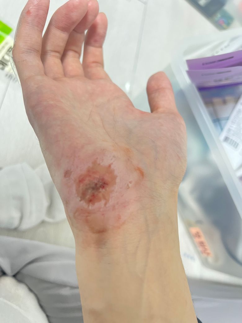 상처가 회복이 되는 과정에서 흔히 발생할 수 있는 삼출물로 보입니다. 해당 사진만 보았을 때에는 심각한 이차적인 감염 및 그로 인한 염증 소견이 크게 의심스럽거나 하지는 않습니다. 각설하고 상처의 정도가 매우 심해 보이며 최대한 잘 관리하여서 회복을 할 수 있도록 해주어야 할 것으로 보이는데, 흉터는 심하게 남을 가능성이 높아 보입니다.