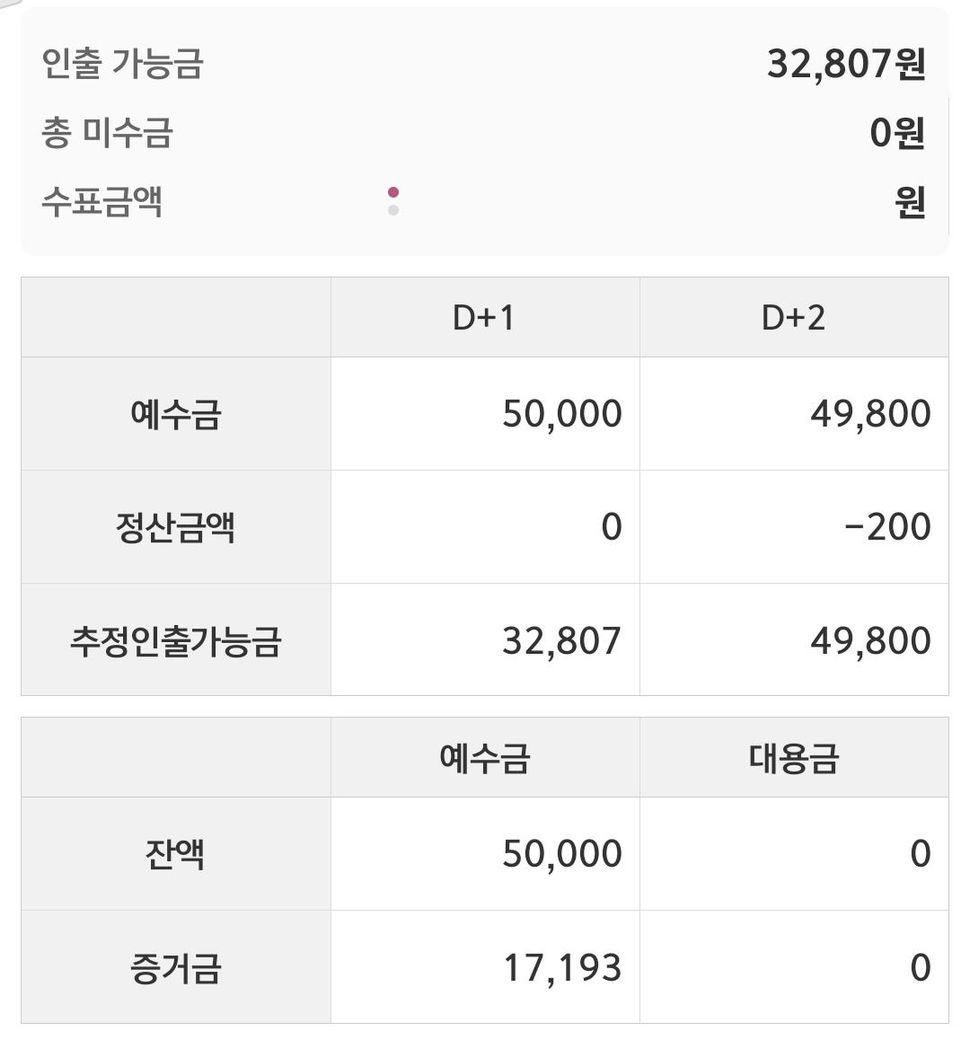 제가 제계좌에 20,000원이 있어서 5,670짜리 주식을 2주를 매수 5,680원으로 2주를 매도하고 그다음 17,190원 짜리 주식을 다시 매수하고 17,020원으로 매도 했는데요 그리고 제가 이계좌에 30,000원을 다시 입금했는데요. 근데 문제는 이렇게 되면 총 금액이 49,800인데 왜 인출가능금액이 32,807원인가요? 이 사진을 해석해주세요.