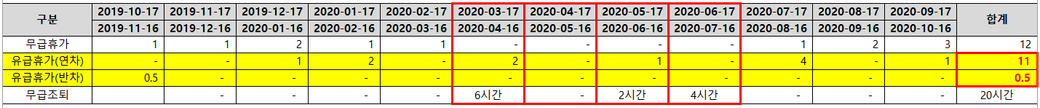 근로자가 무급/유급 연차를 1년사이 총 23.5개를 사용했습니다.