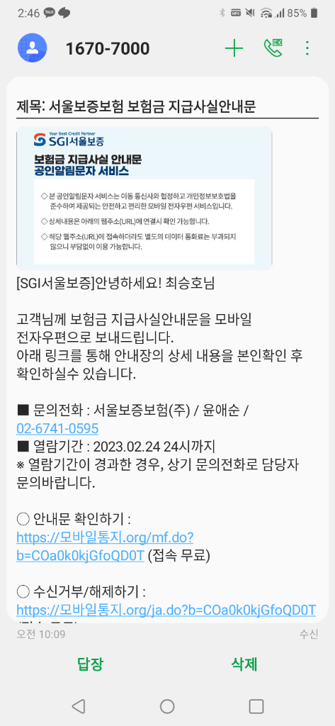보이스피싱일 가능성이 매우 높습니다. 클릭하지 마시고, 인터넷에 기재되어 있는 서울보증보험에 위와 같은 통지가 이루어진 사실이 있는지 여부를 확인해보시기 바랍니다.