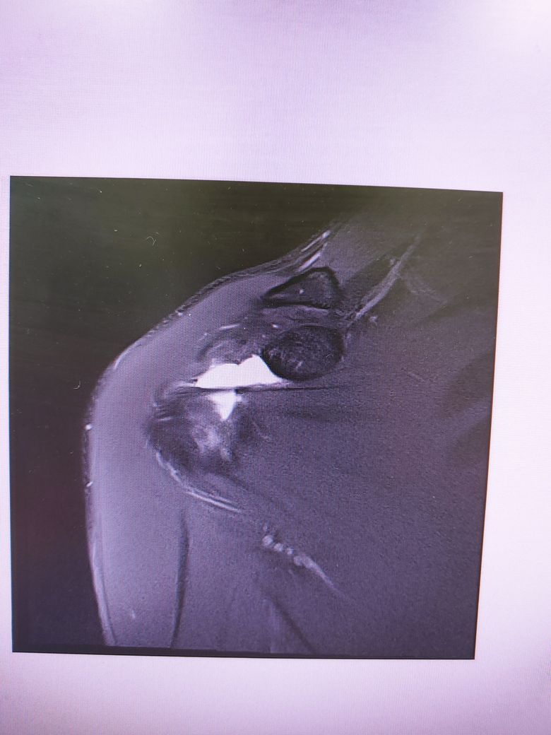 하지만 현재 MRI상 어깨 관절내에 밝게 보이는 곳은 물 또는 혈액등으로, 활액막염 등으로 인해 염증성 변화가 일어난 것으로 보입니다.