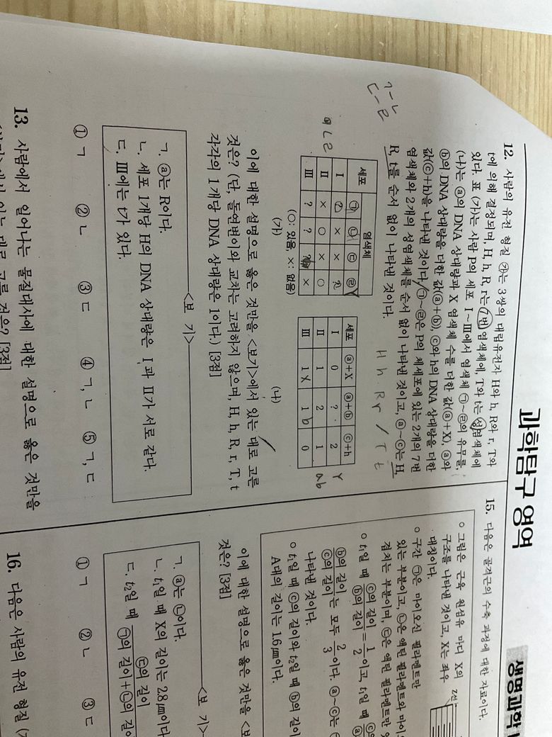 1. ㄱ. 표 (나)에 의하면, ⓐ의 DNA 상대량과 X 염색체 수의 합인 (ⓐ+X) 값은 세포I에서 3, 세포 II에서 1, 세포 III에서 2 입니다. X 염색체의 수가 세포 I~III에서 각각 2, 1 , 1임을 고려하면, ⓐ의 DNA 상대량은 각각 1, 0, 1입니다. ⓐ는 R이라는 보기를 검증하기 위해 R의 유무를 확인할 필요가 있으며, ⓐ의 DNA 상대량이 0인 경우도 있어 ⓐ는 R이 아닐 가능성이 높습니다.