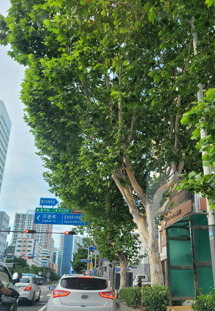 플라타너스라고 하는 나무입니다. 크게 자라다 보니 그만큼 이산화탄소 저장 능력이 뛰어나고 넓은 그늘을 제공해주지만 꽃가루로 인한 폐해가 심해서 요즘에는 거의 심지 않습니다.