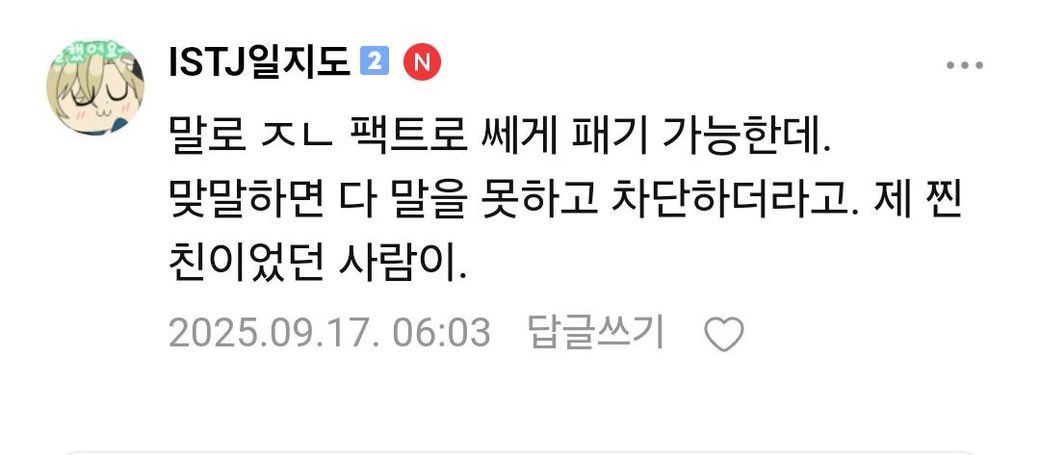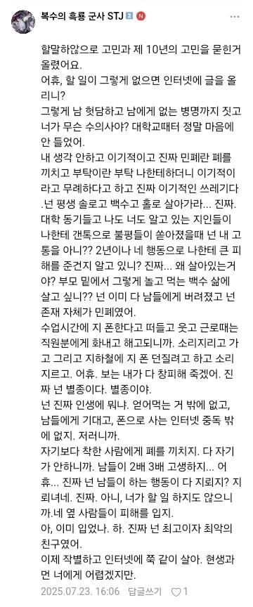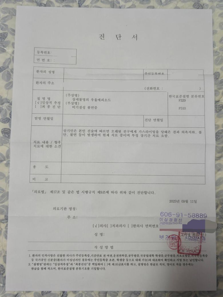 약 2015년 중학교 1학년때 만난 친구를 2025년 3월 말 경에 손절치고 그뒤부터 인터넷 커뮤니티 공간에 저에 대해 직접적인 언급이 아닌 간접적인 언급을 하고는 막 저에 대해 안좋은 말 등등을 하면서 막 퍼트리고 제가 마침 나쁜 사람이다 라는 식으로 말을 퍼트리고 협박도 하는데 말로 설명할려니 길어질거같아서 직접 첨부 자료 올립니다 또한 제가 정신과가서 초진 심리검사하고 진료받고 의사의 객관적인 판단이 써져있는 진단서도 첨부합니다 이와 관련된 할말이 있는데 우울증은 진단서에 적혀있으니 사실이고 피해망상은 진단서에 안적혀있는데 피해망상있다고 허위사실 유포까지 해요
