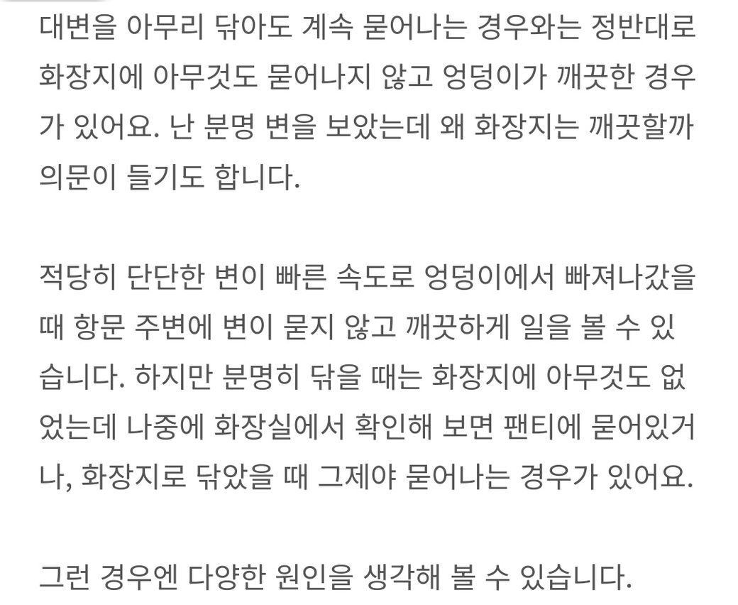 건조한 상태의 변이 깨끗하게 배출되는 경우 바로 휴지에 묻어나지 않을수도 있습니다 시간이 지나 항문주변에 습기가 차거나 눅눅해지면 그제야 휴지에 묻어나는 경우도 생깁니다 그래서 대변후에는 비데를 하시는것이 좋고 비데 사용을 못하신다면 물티슈로 항문주변을 닦아주시는것이 좋습니다