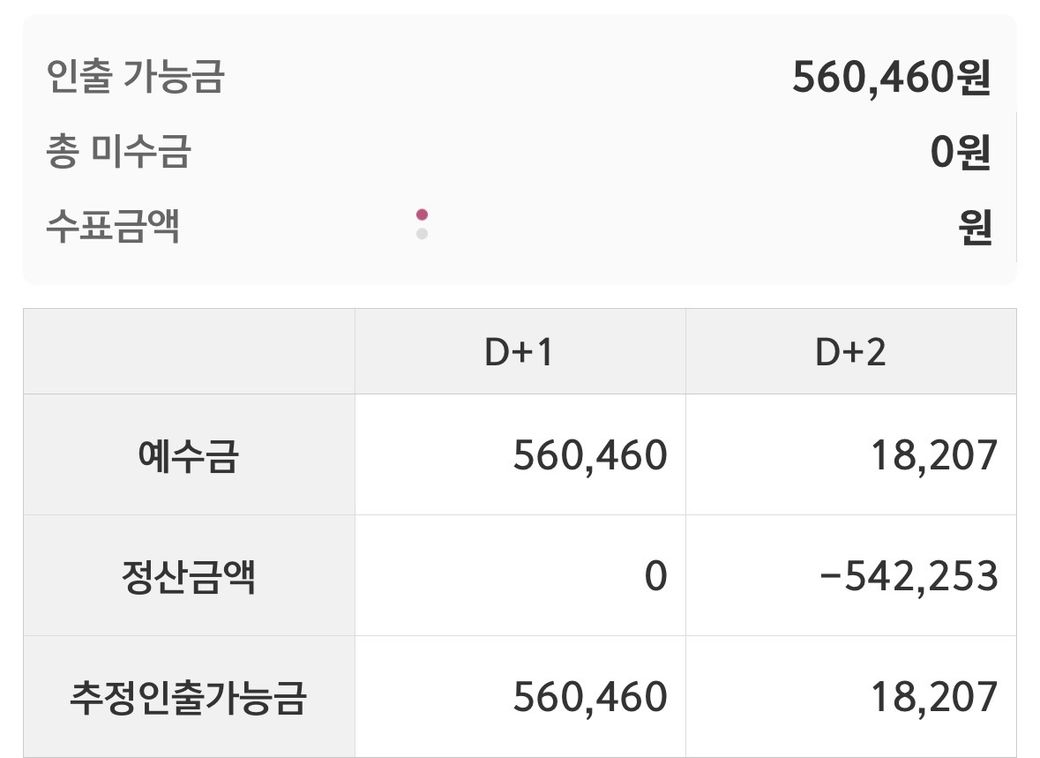 주식 매도 후 재매수 과정에서 D+2 정산 금액이 마이너스라면, 결제일에 해당 금액만큼 계좌에서 돈이 빠져나간다는 의미입니다. 주식 매도 대금은 2영업일(D+2) 후에 들어오고, 매수 대금은 2영업일(D+2) 후에 빠져나가는데, 만약 새로 매수한 금액이 매도한 금액보다 커서 총 예수금이 마이너스로 표시된다면, 결제일에 계좌 잔고가 부족하다는 의미입니다.