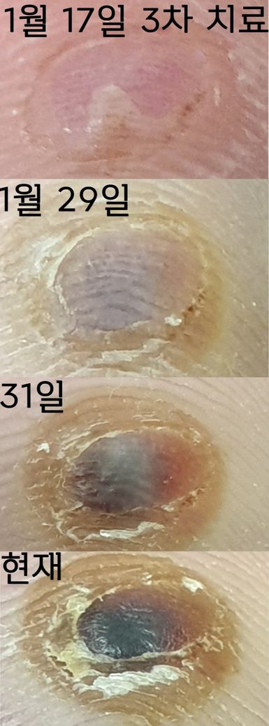냉동치료 했는데 한 6일 전부터 치료 부위가 어두워지더니 지금은 검게 변했어요 1, 2차 치료했을 때는 이런적 없었는데 물집도 없고 피가 피부 속에서 고였는데 가만히 놔둬야 하나요?