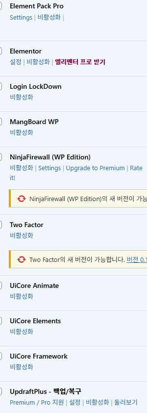 WordPress, UI Core, 테마/플러그인 모두 최신 버전인지 확인