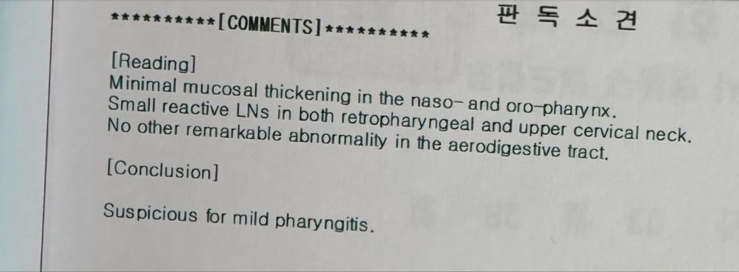 결론적으로, 이러한 검사 결과를 종합해 볼 때, 경미한 인후염(mild pharyngitis)이 의심된다는 진단이 내려졌네요. 인후염은 보통 바이러스나 세균 감염으로 인해 발생하며, 목의 통증, 따끔거림, 또는 불쾌감과 같은 증상을 동반할 수 있는 상태입니다.