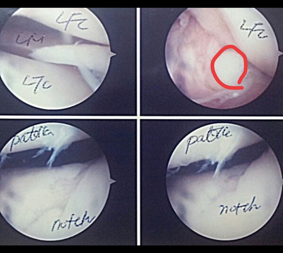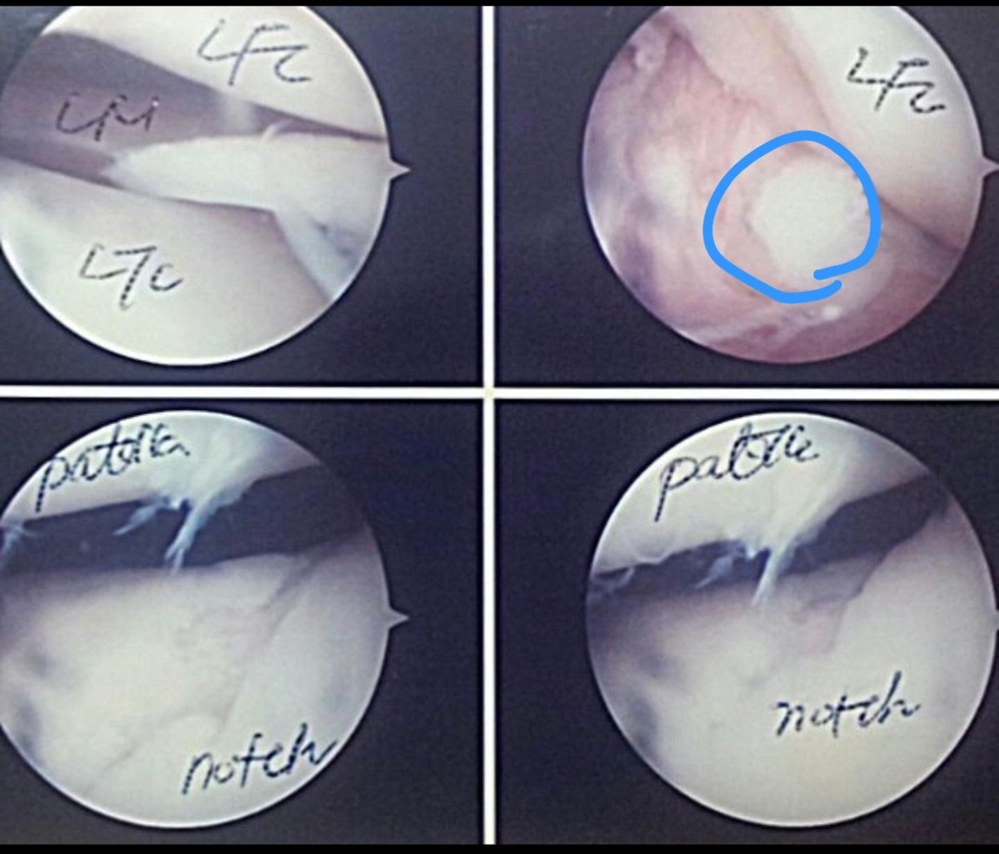 무릎 관절경 사진인데 , 여기서 뼈 조각이 어떤 건지 정확히 모르겠습니다. 사진에 표시 부탁드립니다.
