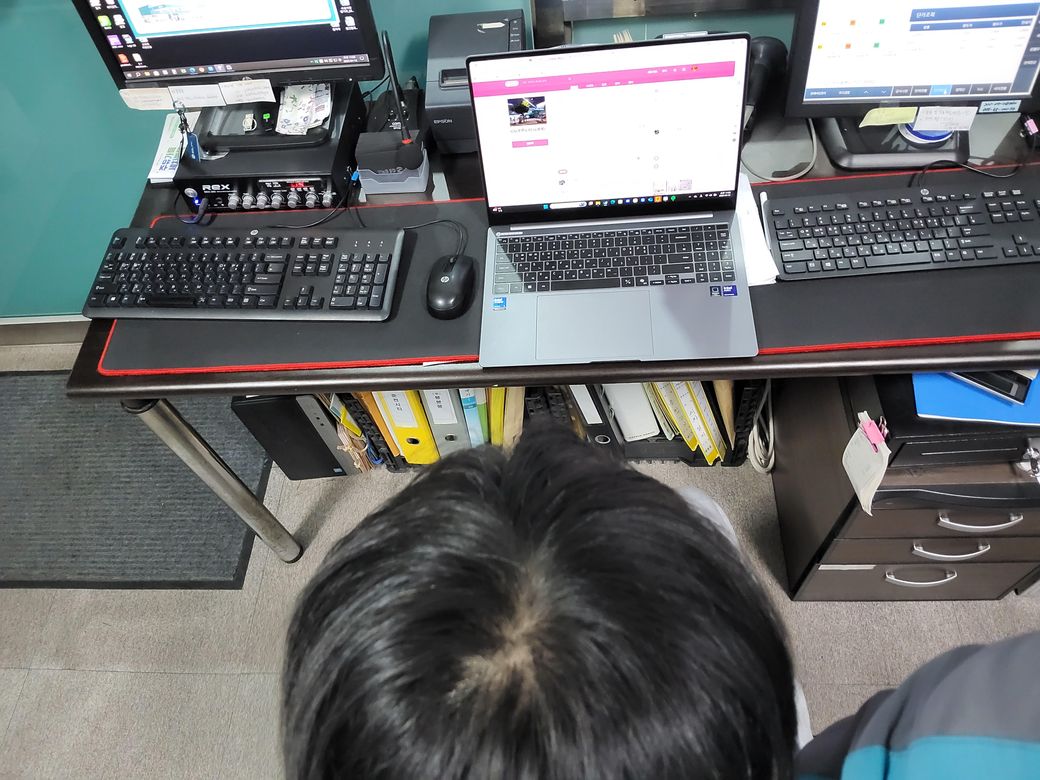 여기까진 일상 속 가르마 타는 스타일대로 찍어봤고, 아래는 머리를 정수리 중심으로 푹 눌러봤습니다.