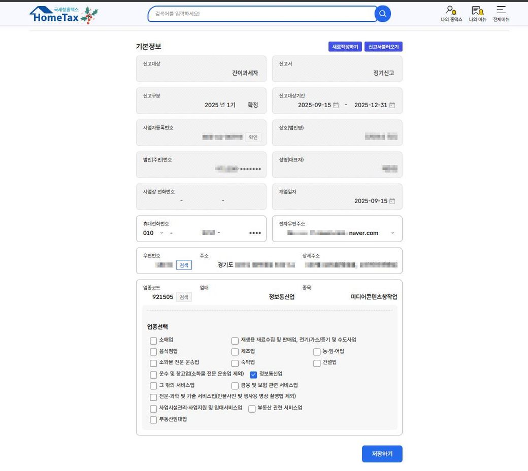 신고 유형 및 기간 설정: 25년 9월 개업 후 12월 말까지의 내역을 신고할 때, '간이과세자 / 2025년 1기 확정 신고'로 설정하여 진행하는 것이 맞는지 확인이 필요합니다.