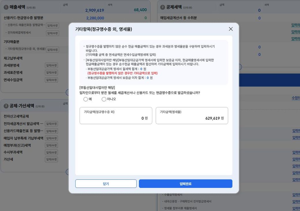 - 이 내용을 "기타금액(영세율)"에 추가하는 것이 맞나요? 아니면 "기타금액(정규영수증 외)"에 넣어야 하나요?