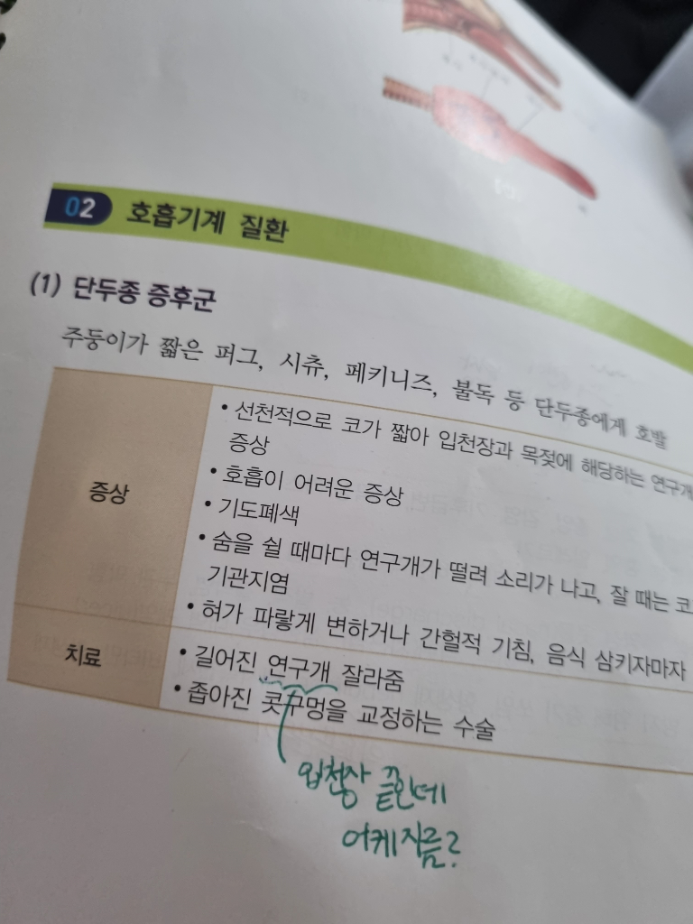 단두개종은 퍼그나 불독 같은 품종으로 주둥이가 움푹 들어가서 짧습니다. 그러다보니 그 작은 공간에 혀 치아 인두 후두덮개가 있어야 하므로 주둥이가 긴 강아지와는 해부학적 위치가 좀 많이 다릅니다.