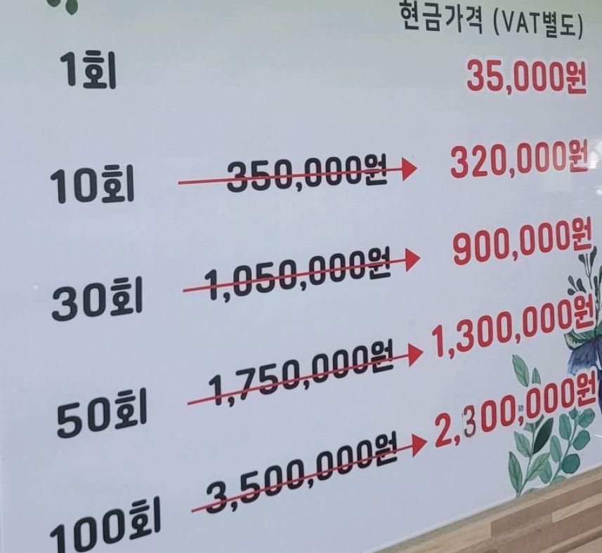 현금가격과 VAT별도 라고 명시되어있는 요금표가 붙어있습니다.