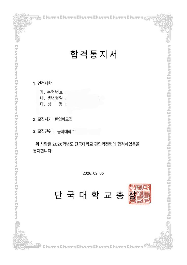 이번에 편입 시험을 봐서 전적대 지잡대에서 단국대로 합격했습니다.