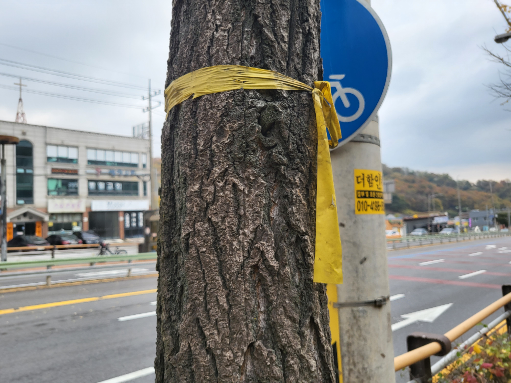 나무마다 이런 노란색 끈에 매달려 있던데요.
