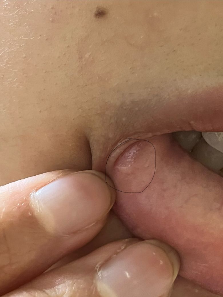 지금 사진으로는 확인을 정확히 할 수 없습니다. 단순 찰과상이나 구내염일 가능성이 커 보이나 정확한 판단을 위해서는 다각도적인 검사를 해보아야 하며 현재 사진 한 장으로는 판단이 어렵습니다. 지속적으로 불편감이 나타나신다면 가까운 치과 방문 후 평가를 받아보시길 바랍니다.
