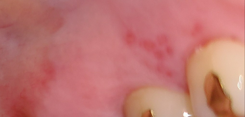 현재 사진으로 보아 구강 내 연조직 질으로 보여집니다. 단순 구내염은 아닌 것으로 보여지며 치과 방문 후 해당 연조직 질환에 대한 감별진단이 필요합니다. 물론 경미한 경우에는 2주 안에 회복되지만 불편감이 너무 크다면 치과 방문 후 적절한 원인 규명을 하고 치료를 하는 것이 맞습니다.