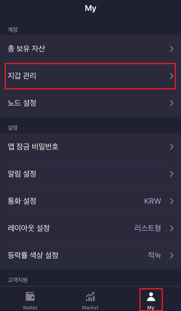 노바(NOVA) 지갑의 하단에 있는 "MY" 메뉴에 접속 후 "지갑 관리" 항목을 선택합니다.