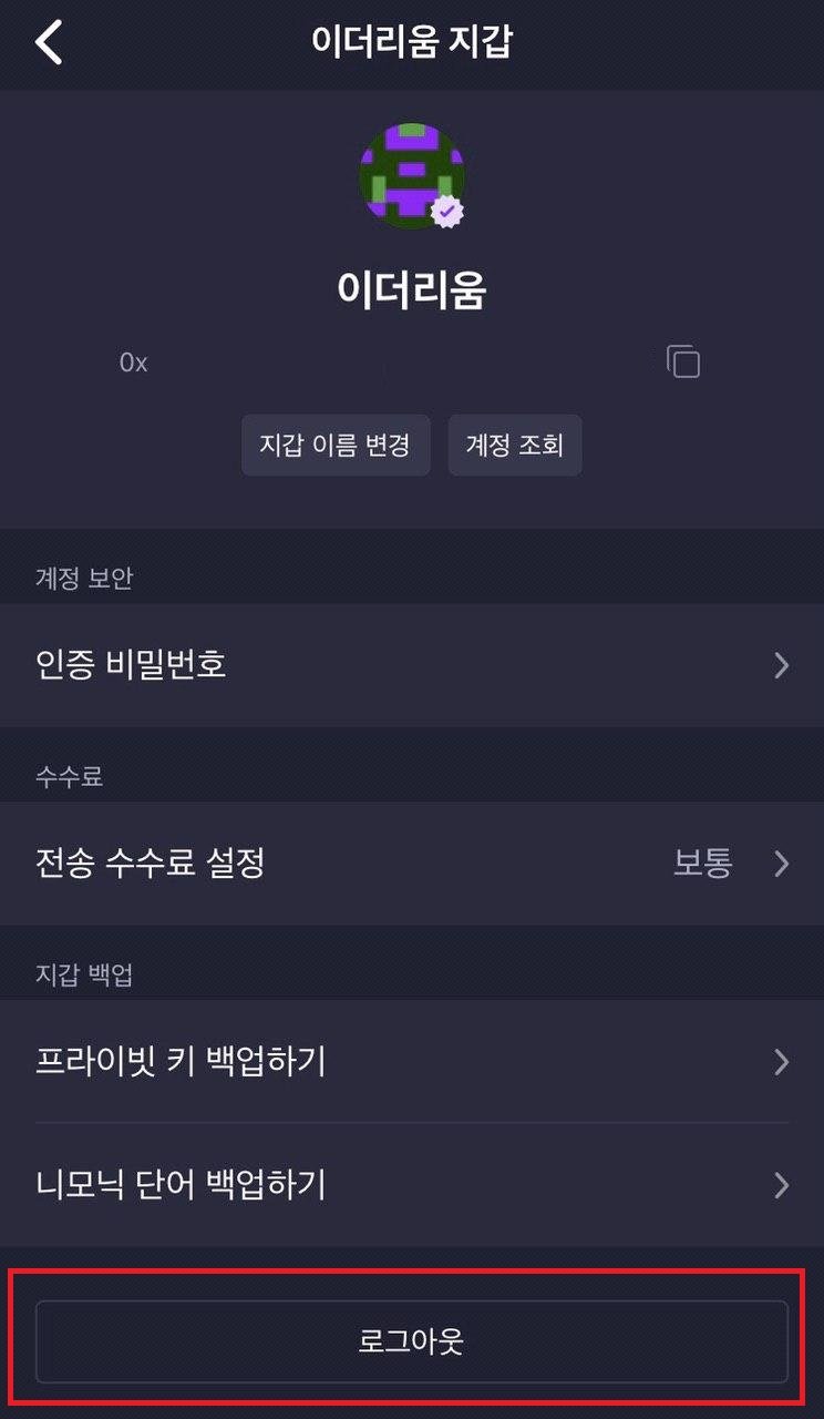 3. 아래 그림에서 아래 "로그아웃"을 하게 되면 지갑이 삭제됩니다. 물론 니모닉 코드를 사용하여 다시 복원할 수도 있습니다.