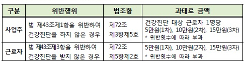 특히, 고의로 검사를 받지 않은 경우에는 사업주에게 1000만 원의 과태료가 부과됩니다. 또한, 사업주가 1년에 2회 이상 건강검진을 안내했음에도 불구하고 이를 이행하지 않은 경우에는 근로자에게도 300만 원의 과태료가 부과될 수 있습니다.