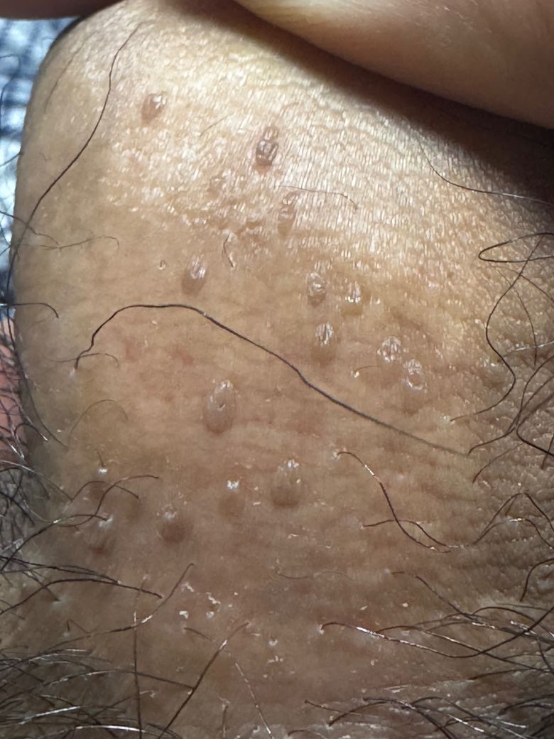 모양만으로 모든 부분을 진단할 수는 없으나, 현재 병변 모양으로 보았을 때 만일 최근에 성적 접촉이 없다고 하신다면 모낭염과 같이 음모(성기의 털)가 자라는 부위 주변부로 염증이 생길 때와 같은 모양의 병변으로 생각되며, 이외에 곤지름의 가능성도 있어보이나 성적 접촉이 없었다면 가능성이 떨어질 것으로 생각됩니다.