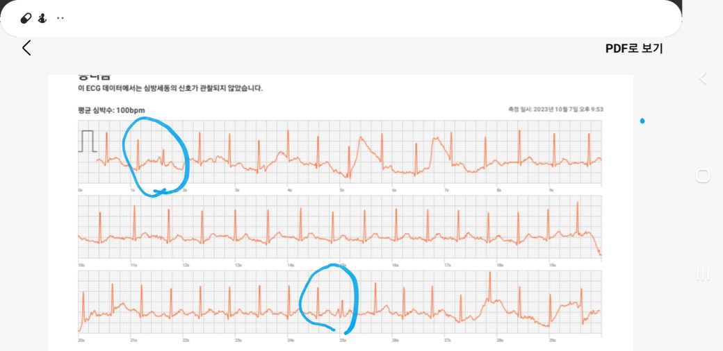 어제 잠을 쫌 못자고 스트레스받았고 친구 생일이라 술을 쫌먹는데 갤럭시워치에 심박수도 100이상 110가까이 빨라지고 워치 심전도를 째보니 조기수축같은 부정맥이 보이는거같드라고요