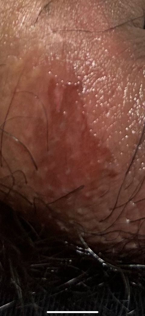 일단 생식기 주변부에 발생한 피부질환으로 성병 여부를 감별해야 할 것으로 보이나, 만일 최근 1개월 이내에 불특정한 상대와 성적 접촉이 없었다고 한다면 현재 상태로는 해당 피부에 지속적으로 마찰이 가해지면서 (쓸리면서) 발생한 피부염이나 벗겨진 증상으로 보입니다.