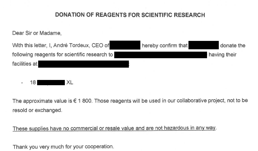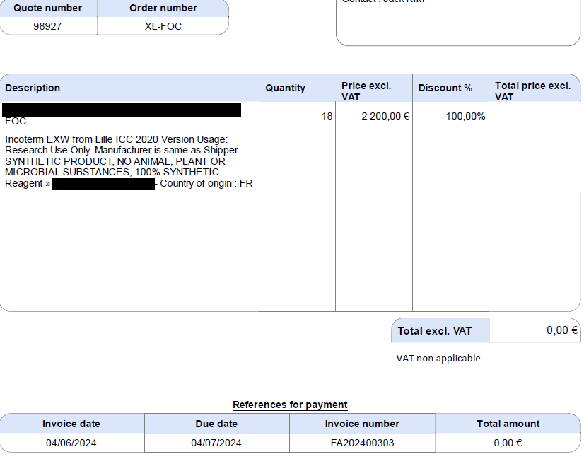 해당 인보이스 검토 결과 관세법 제94 조에 소액물품 면세에 해당될 수는 있으나 해당 조항의 경우에는 감면 요건이 굉장히 까다롭습니다. 예를 들어 실제로 샘플이라는 것을 입증을 해야 되고 실제 견본에 사용된다는 구체적인 견본범위가 법과 지침에 따라 명확하게 규정이 되어 있어야 합니다. 따라서 이러한 샘플 견본을 입증하기 위한 지침 해석을 사전에 수입 전에 관세사측과 충분한 협의를 통해서 감면을 적용받는 것을 추천드리며 또한 해당 물품의 원산지가프랑스이고.eu 에서 직접 운송되는 경우에는한.eu fta 관세혜택을 받을 수 있으므로 해당 fta 적용 여부를 검토받길 바랍니다 또한 샘플이라 하더라도 시약이 세관장 확인 대상에 요건 확인 대상으로 해당되는 경우 면제 요건이 없다면 실제 수입을 받아야 할 수 있으므로 해당 요건 면제 여부 및 요건 인증 여부도 검토를 충분히 하신 후에 수입하시는 것을 추천드리겠습니다 감사합니다.