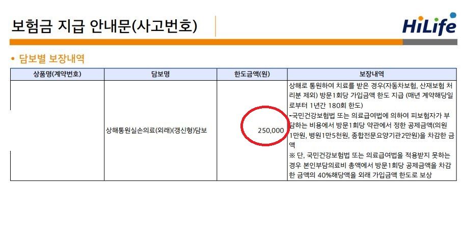 즉, 일 통원치료비 30만원이 나오더라도 일 한도가 25만원이기에 25만원까지만 보상을 한다는 의미입니다.
