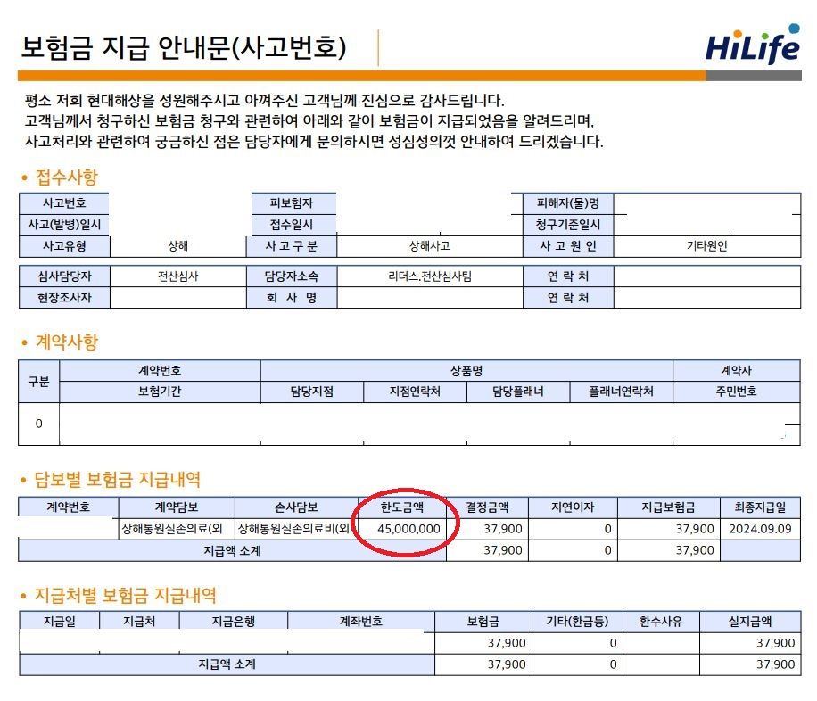 실손보험이 중복으로 가입되어 있는 경우 또는 단체보험이 가입되어 있으면 한도금액이 합산해서 표기될 수 있습니다.