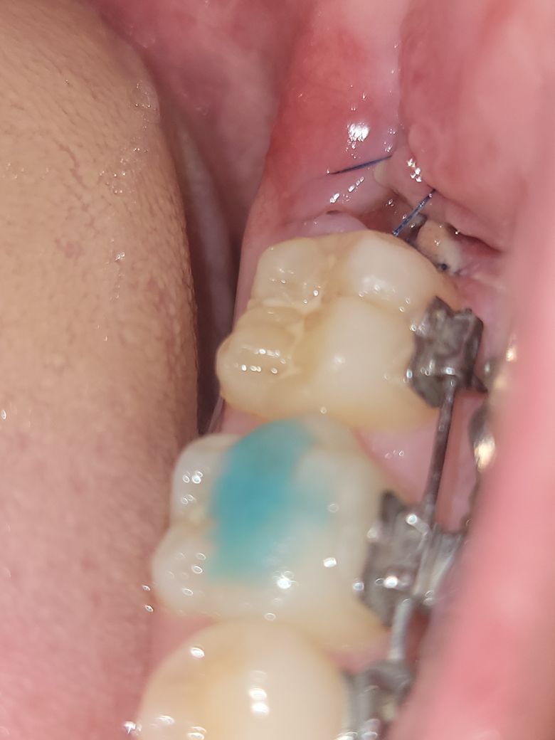 잘 아무는 것으로 보입니다. 일단 가글로 빼내는 수밖에 없습니다.